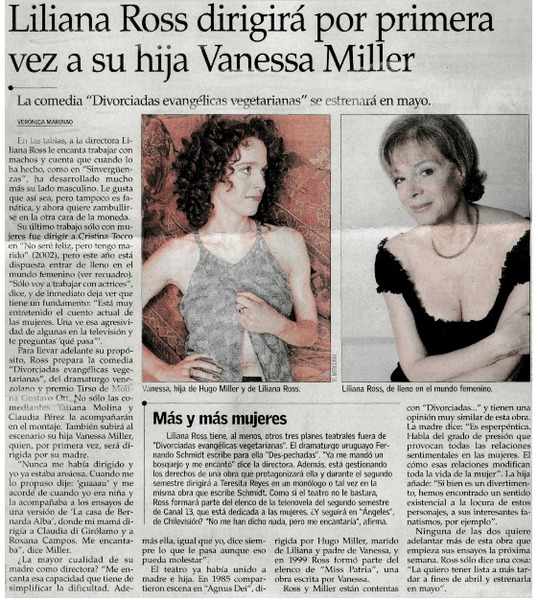 Liliana Ross dirigirá por primera vez a su hija Vanessa Miller [artículo] Verónica Marinao.