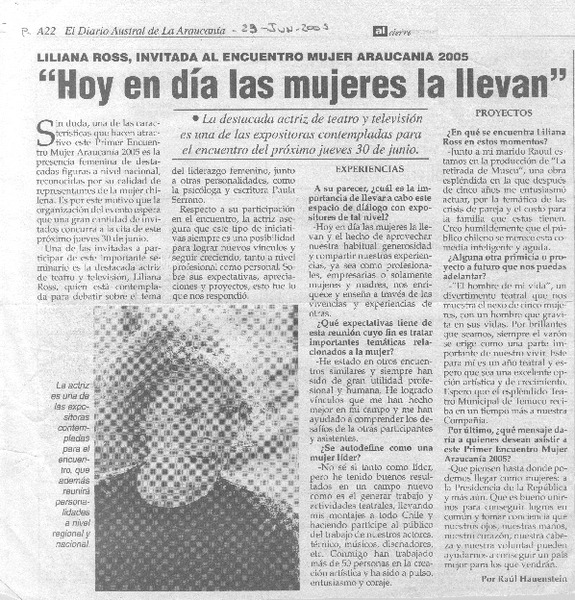 "Hoy en día las mujeres la llevan". (entrevistas) [artículo] Raúl Hauenstein