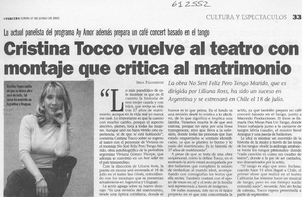 Cristina Tocco vuelve al teatro con montaje que critica al matrimonio [artículo] Irma Palominos