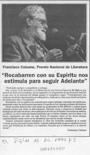"Recabarren con su espíritu nos estimula para seguir adelante" [artículo] Francisco Coloane.