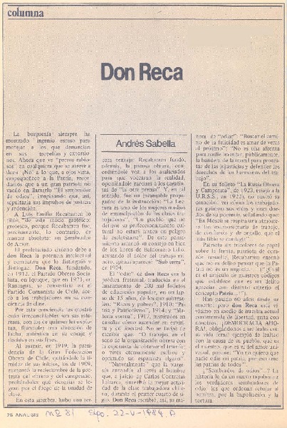 "Don Reca" [artículo] Marino Muñoz Lagos.