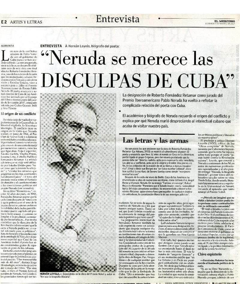 "Neruda se merece las disculpas de Cuba" (entrevista) [artículo] Alvaro Matus.