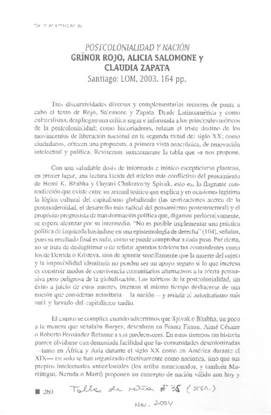 Autores chilenos - Rojo, Grínor - Salomone, Alicia - Zapata, Claudia - Postcolonialidad y nación - "Postcolonialidad y nación"