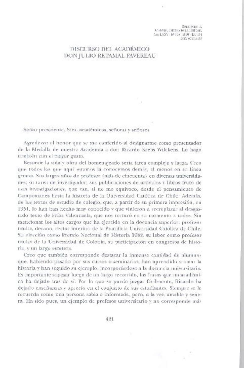 Discurso del académico don Julio Retamal Favereau [artículo] Julio Retamal Favereau.