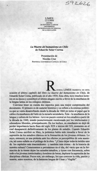 La muerte del humanismo en Chile de Eduardo Solar Correa [artículo] Nicolás Cruz Barros