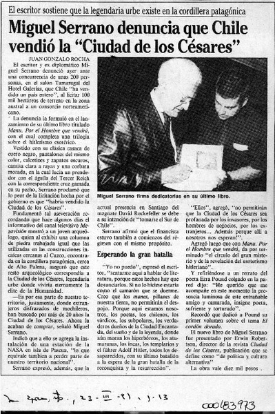 Miguel Serrano denuncia que Chile vendió la "Ciudad de los Césares" [artículo] Juan Gonzalo Rocha.