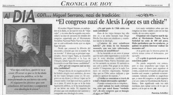 "El congreso nazi de Alexis López es un chiste" [artículo] Patricia Schüller