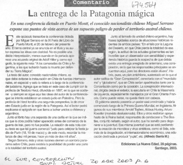 Autores chilenos - Serrano, Miguel - Entrega de la Patagonia mágica