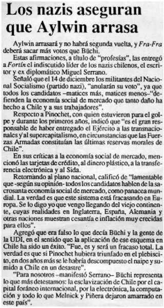 Los nazis aseguran que Aylwin arrasa. [artículo]
