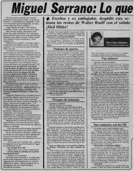Miguel Serrano: lo que piensa hoy un nazi : [entrevistas] [artículo] Lilian Olivares.