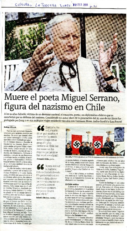 Muere el poeta Miguel Serrano, figura del nazismo en Chile [artículo] Rodrigo Miranda.