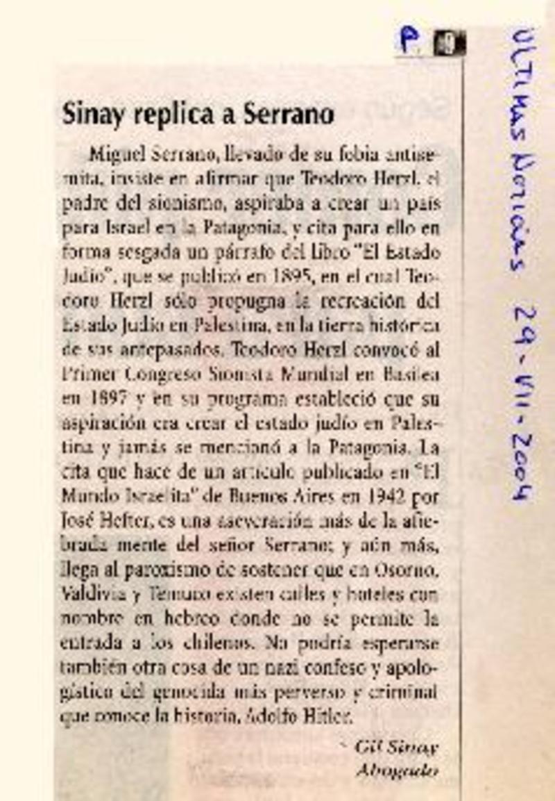 Sinay replica a Serrano [artículo] Gil Sinay.