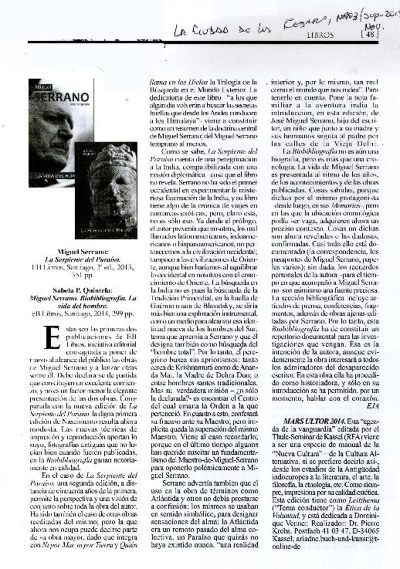 Singular trilogía de Miguel Serrano [artículo] Vicente Mengod.