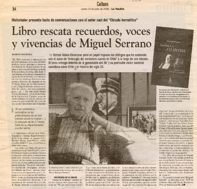 Libro rescata recuerdos, voces y vivencias de Miguel Serrano [artículo] Mauricio Valenzuela.