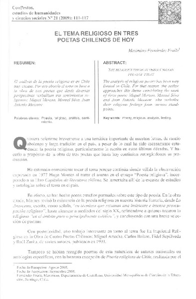 El tema religioso en tres poetas chilenos de hoy [artículo] Maximino Fernández Fraile.