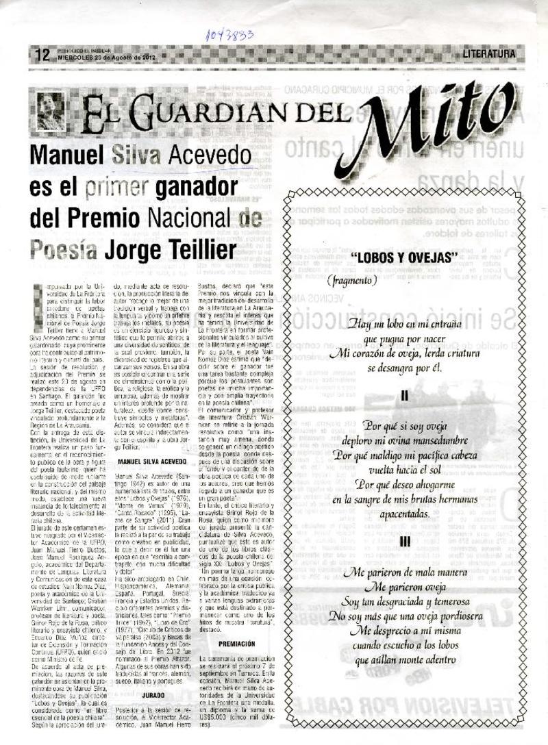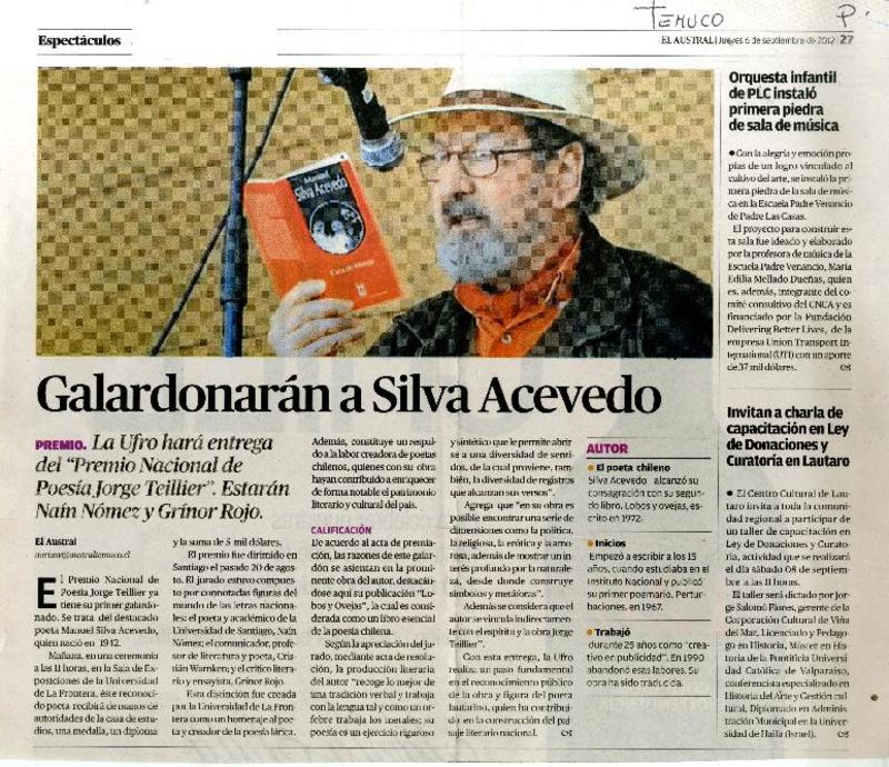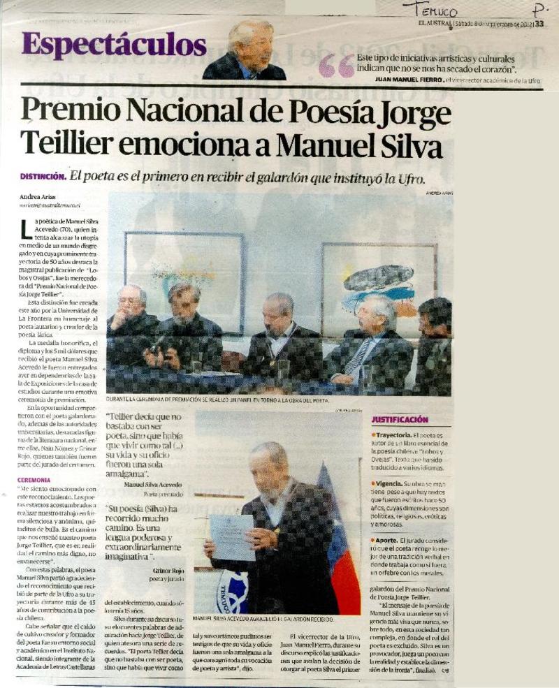 Premio nacional de poesía Jorge Teillier emociona a Manuel Silva [artículo] Andrea Arias.