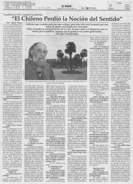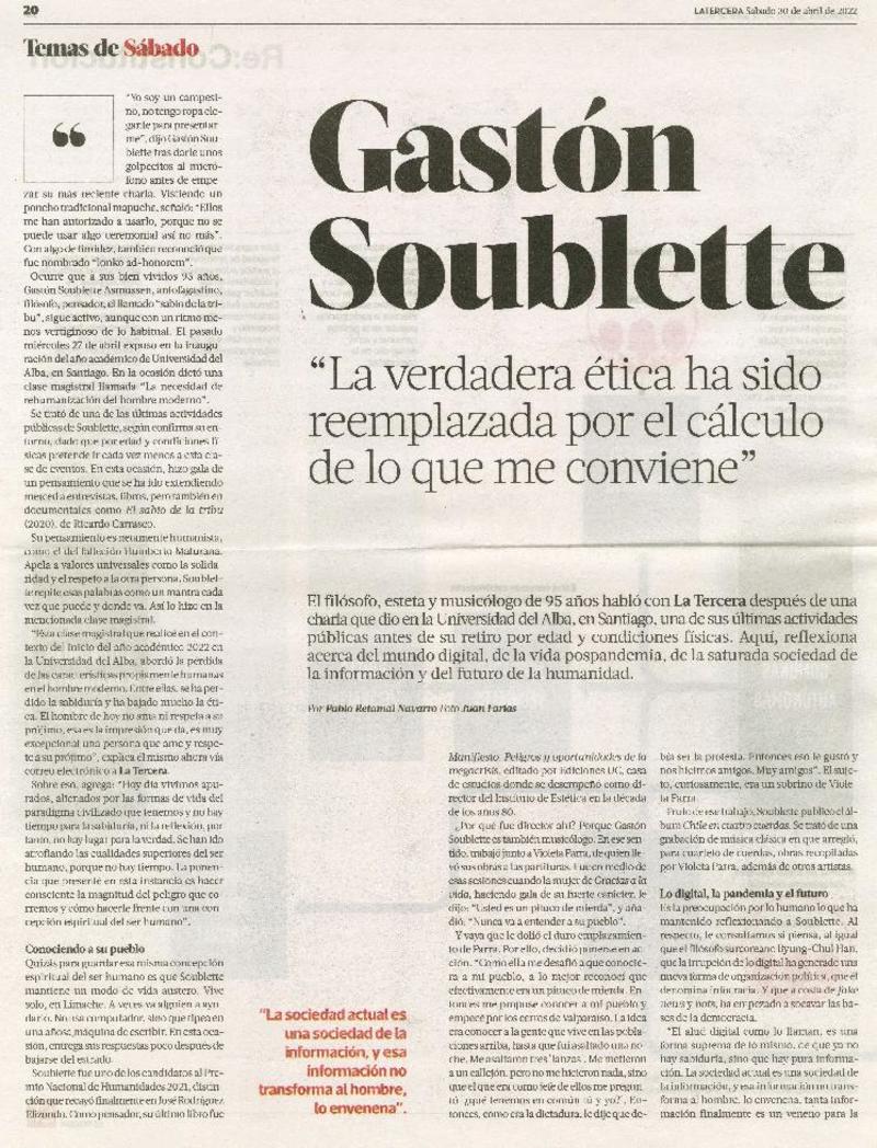 Gastón Soublette, la verdadera ética ha sido reemplazada por el cálculo de lo que me conviene" [artículo] : Pablo Retamal Navarro.