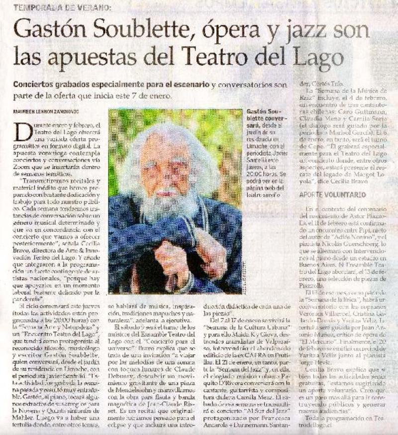 Gastón Soublette, ópera y jazz son las apuestas del Teatro del Lago [artículo] Maureen Lennon Zeninovic.