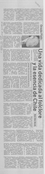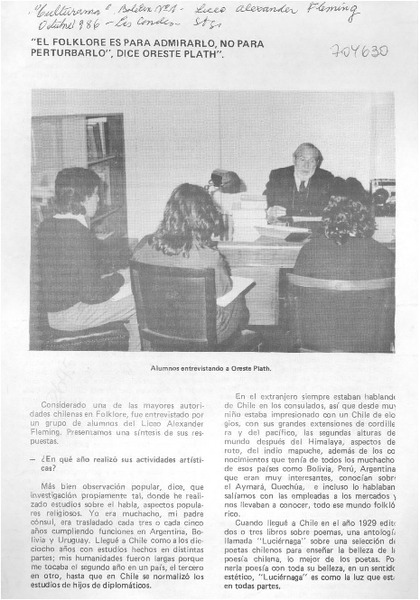 "El folklore es para admirarlo, no para perturbarlo", dice Oreste Plath : [entrevista] [artículo] Pamela Reyes, José Reyes y Lorena González.