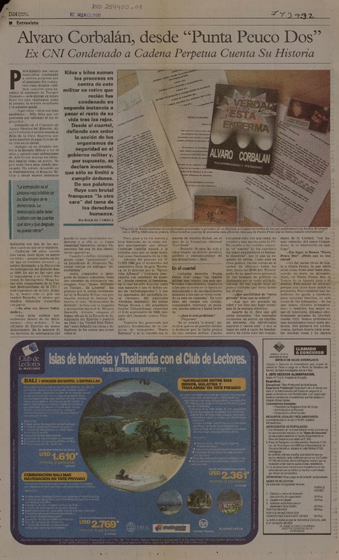 Alvaro Corbalán, desde "Punta Peuco Dos" ex CNI condenado a cadena perpetua cuenta su historia [artículo] : Raquel Correa.