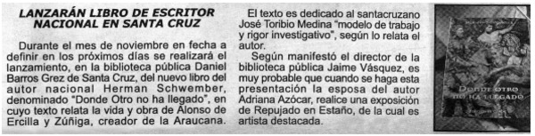 Lanzarán libro de escritor nacional en Santa Cruz. [artículo]