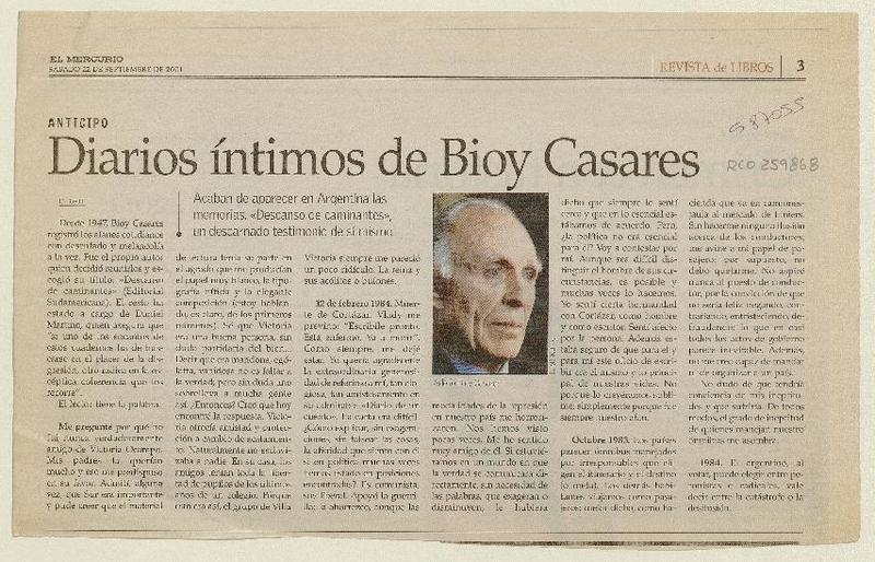 Diarios íntimos de Bioy Casares [artículo] Cecilia Garciam., Huidobro.