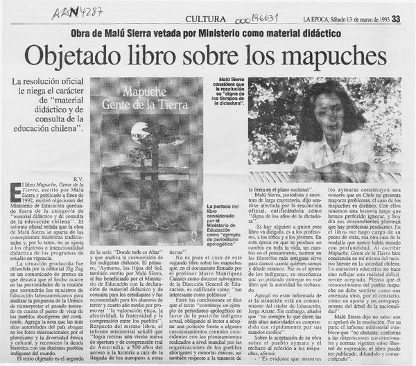 Objetado libro sobre los mapuches [artículo] R. V.