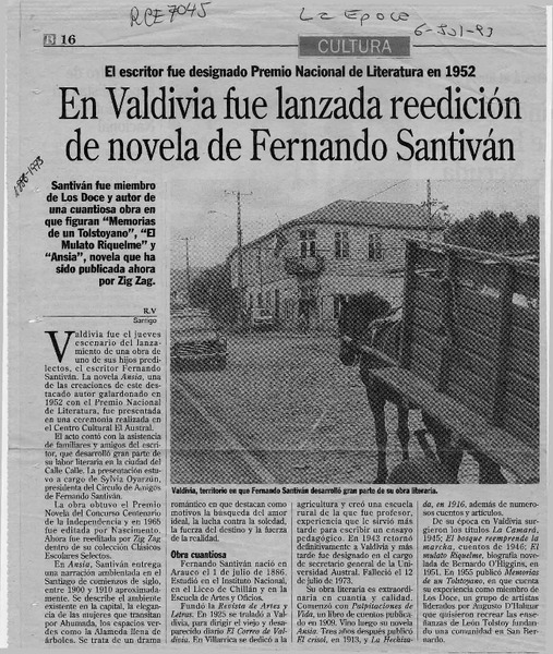 En Valdivia fue lanzada reedición de novela de Fernando Santiván [artículo] R. V.