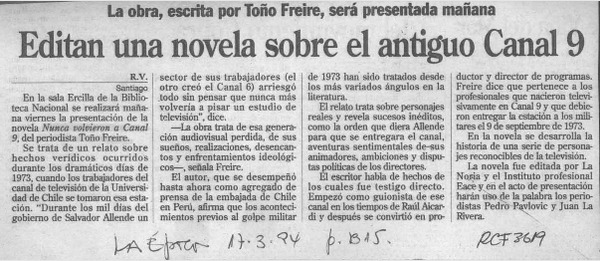 Editan una novela sobre el antiguo canal 9 [artículo] R. V.