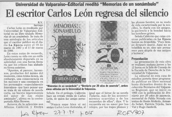 El escritor Carlos León regresa del silencio [artículo] R. V.