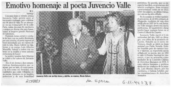 Emotivo homenaje al poeta Juvencio Valle [artículo] R. V.