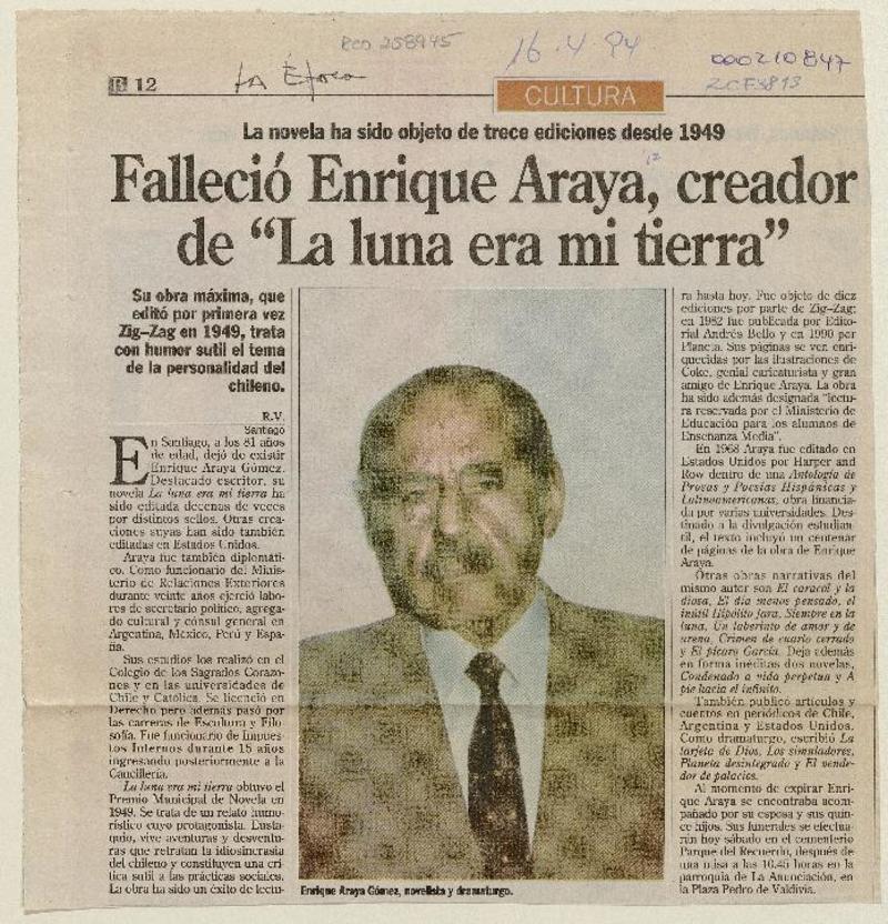 Falleció Enrique Araya, creador de "La luna era mi tierra" [artículo] R. V.