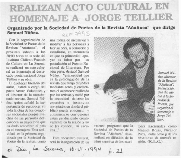 Realizan acto cultural en homenaje a Jorge Teillier [artículo].