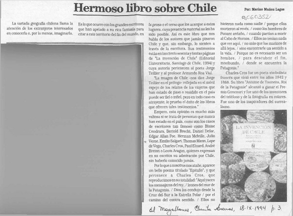 Hermoso libro sobre Chile [artículo] Marino Muñoz Lagos.