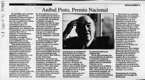 Aníbal Pinto, Premio Nacional [artículo] Oscar Muñoz G.