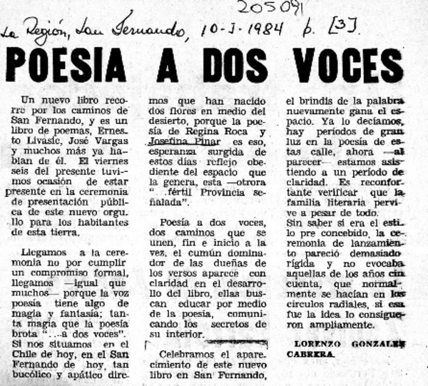"Poesía a dos voces" [artículo] José Arraño Acevedo.