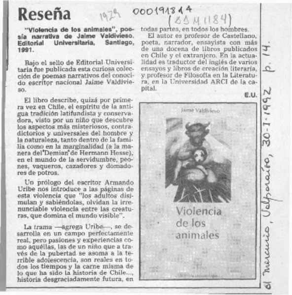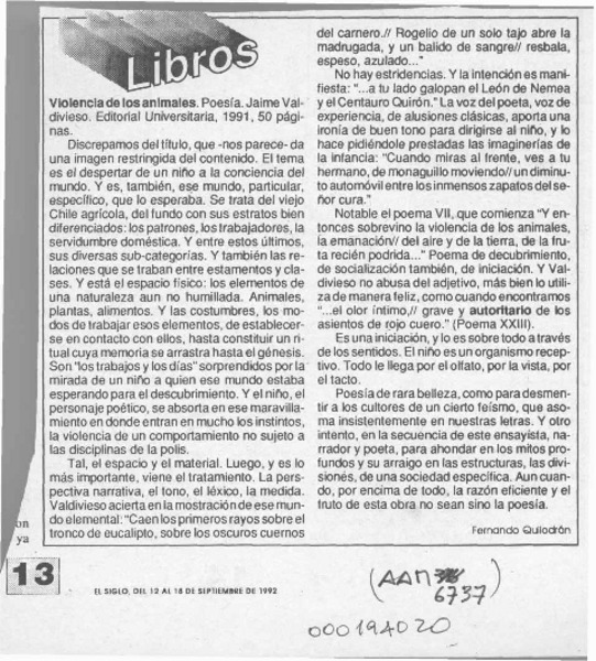 Violencia de los animales [artículo] Fernando Quilodrán.