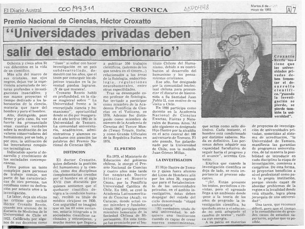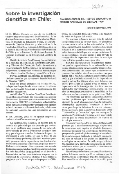 Sobre la investigación científica en Chile : diálogo con el Dr. Héctor Croxatto R. premio nacional de ciencias 1979 [artículo] Rafael Sepúlveda Jara.