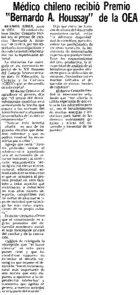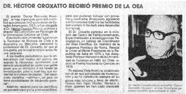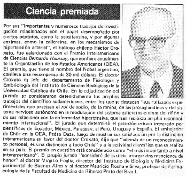 Doctor Héctor Croxatto obtuvo premio de ciencias en la OEA. [artículo]
