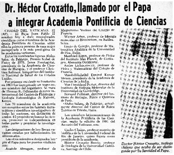 Dr. Héctor Croxatto, llamado por el Papa a integrar Academia pontificia de ciencias. [artículo]