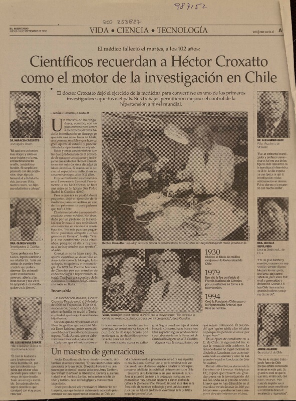 Científicos recuerdan a Héctor Croxatto como el motor de la investigación en Chile [artículo] L. Guzmán, P. Leighton y C. González.