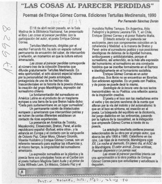 "Las cosas al parecer perdidas" [artículo] Fernando Sánchez Durán.