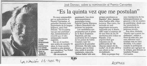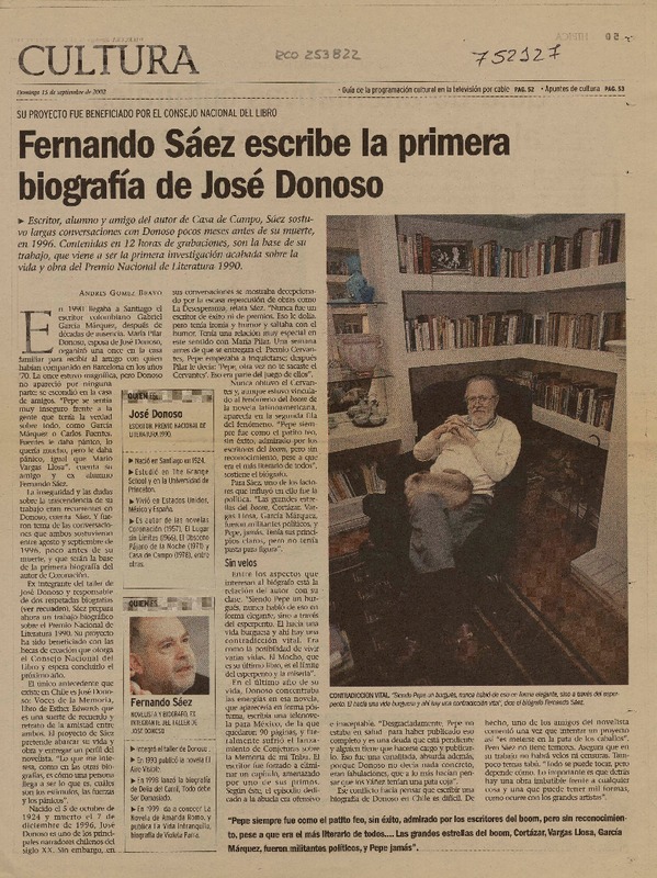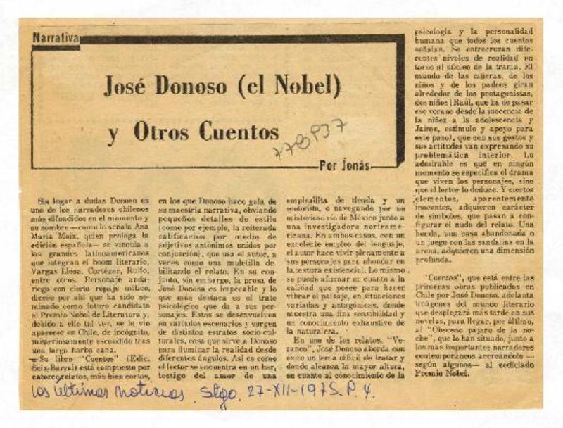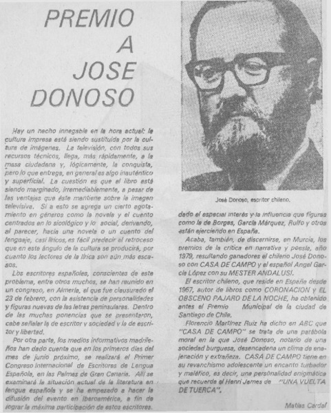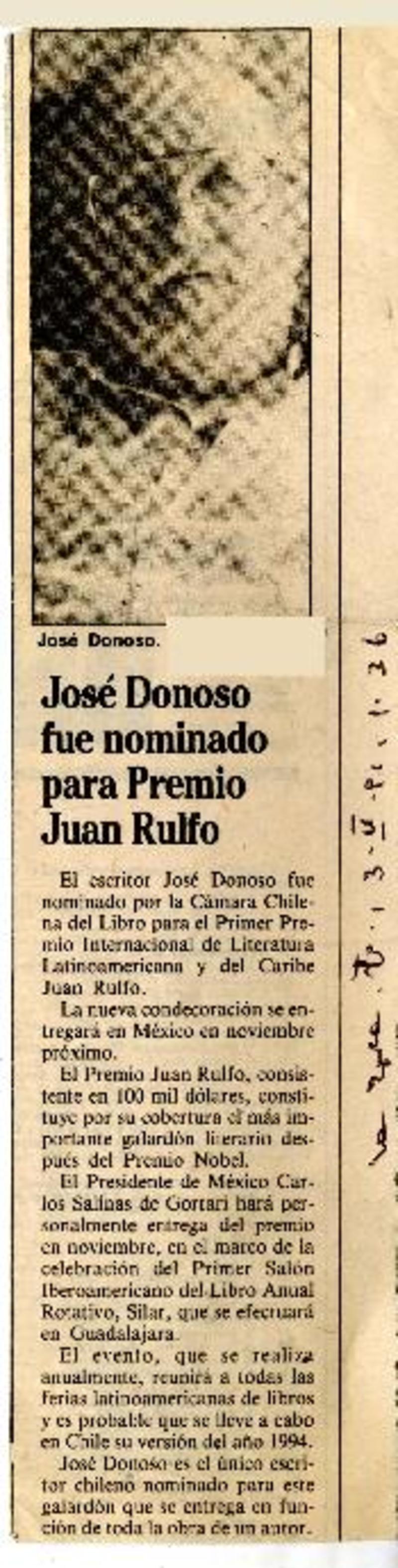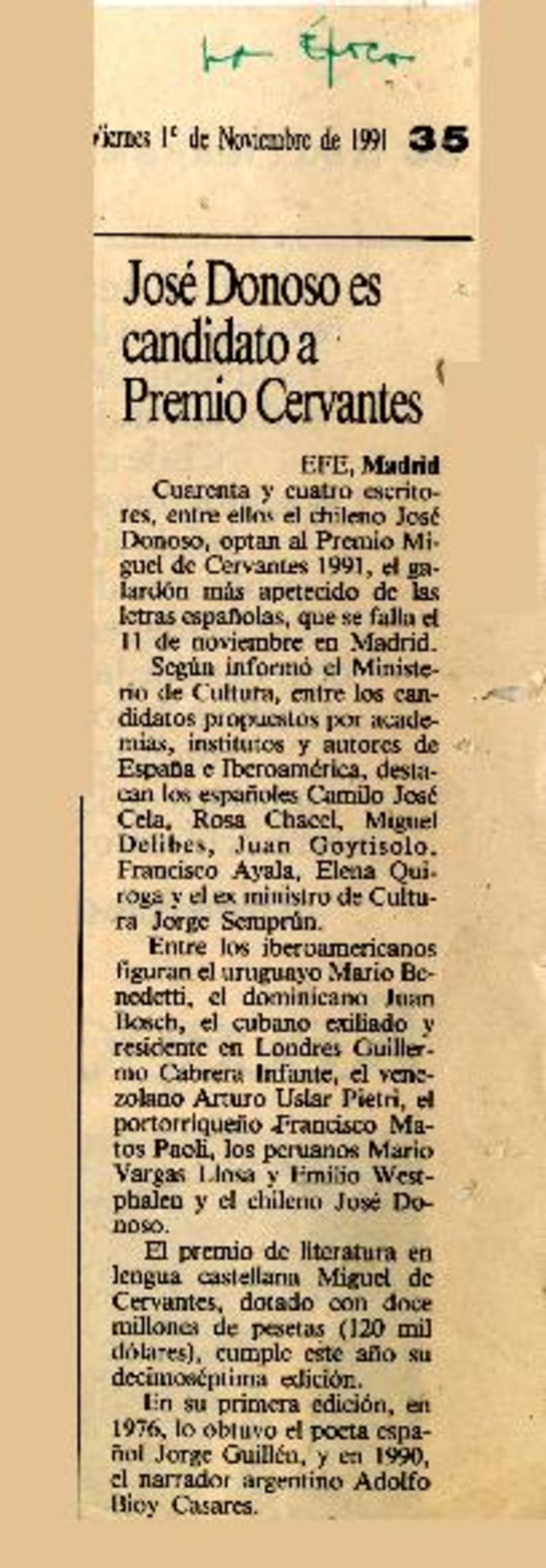 Autor chileno José Donoso postula al Premio Cervantes [artículo].
