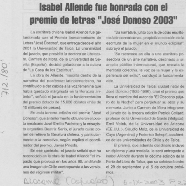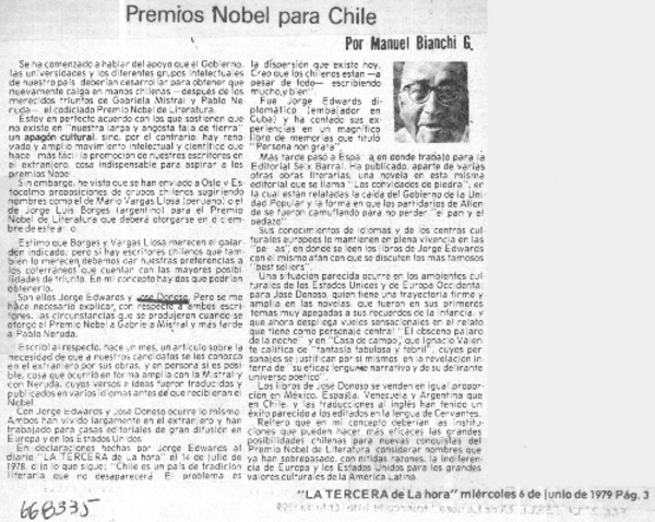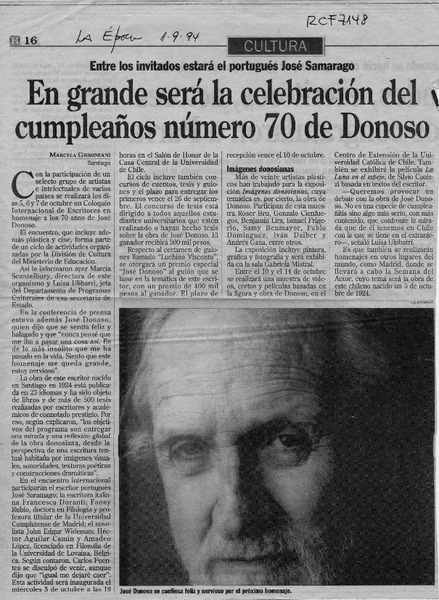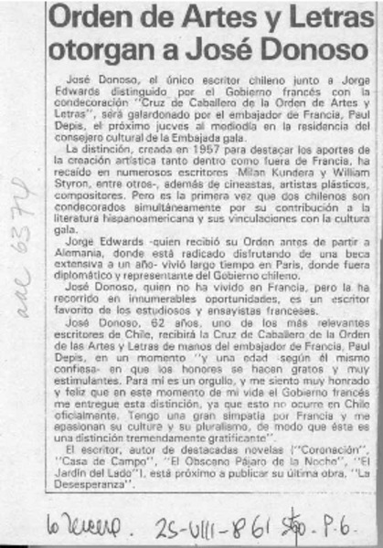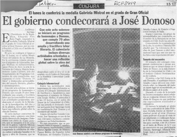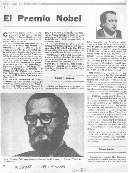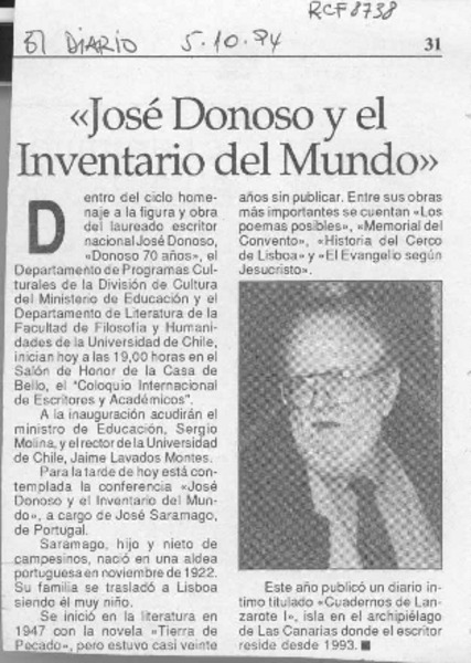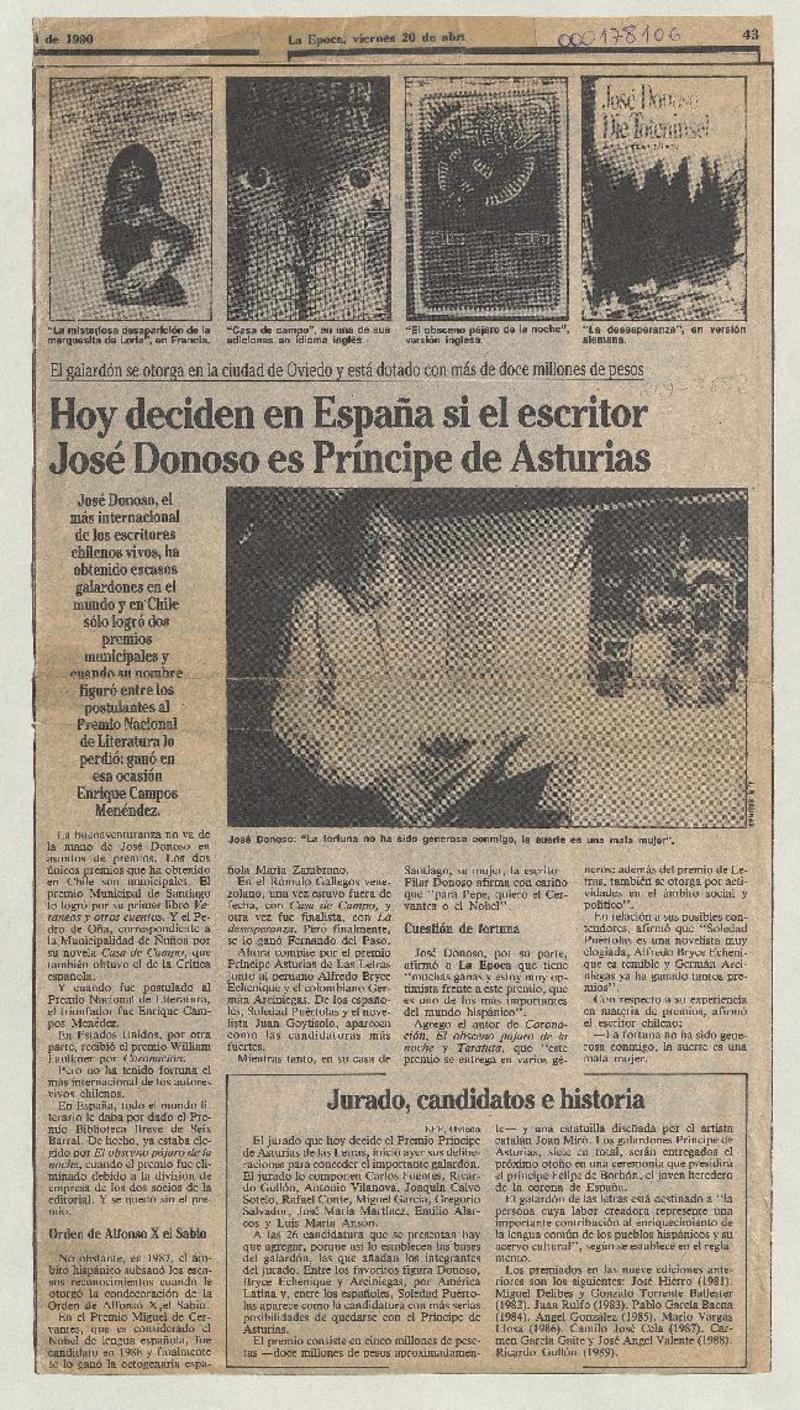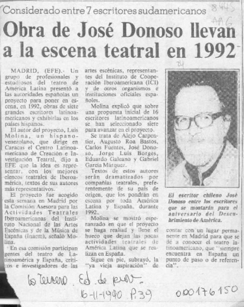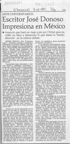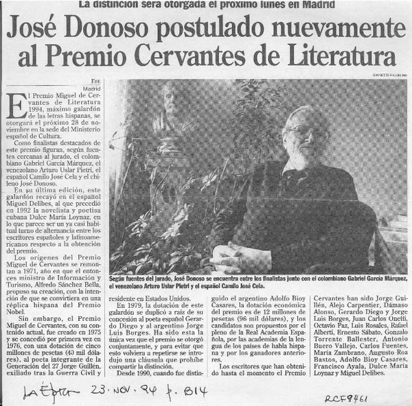 Autor chileno José Donoso postula al Premio Cervantes [artículo].