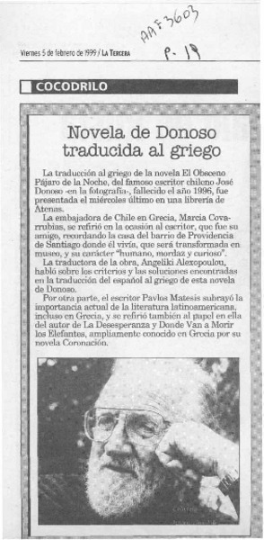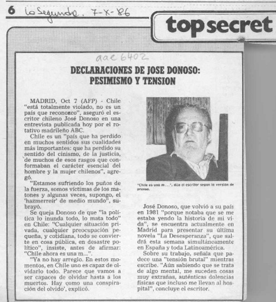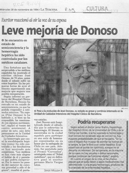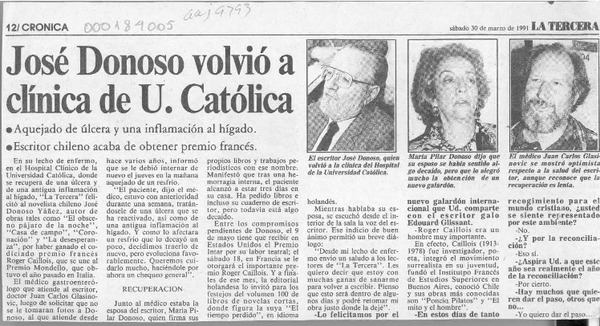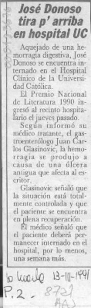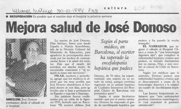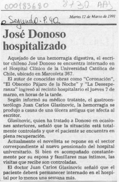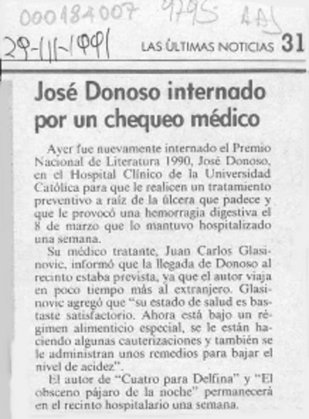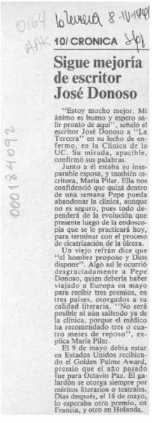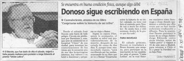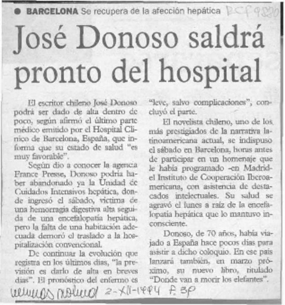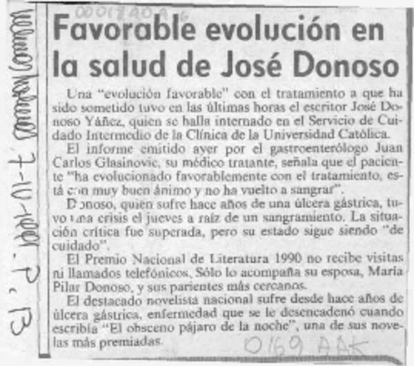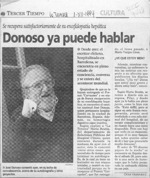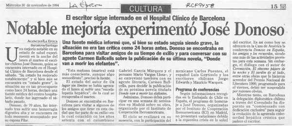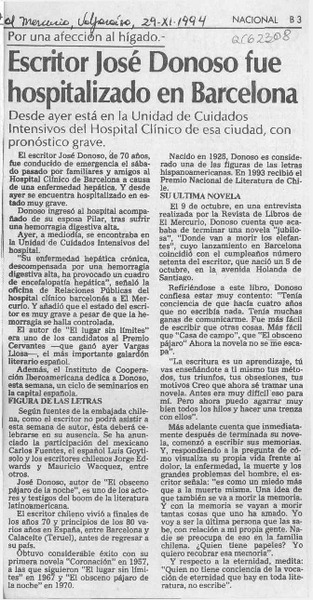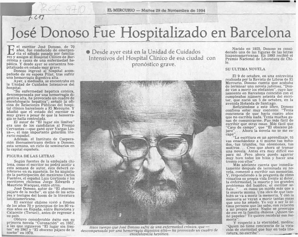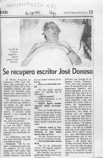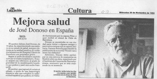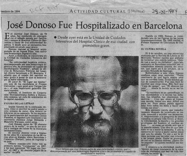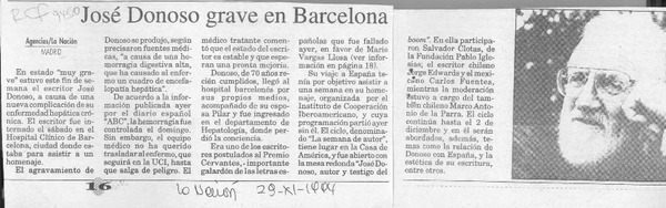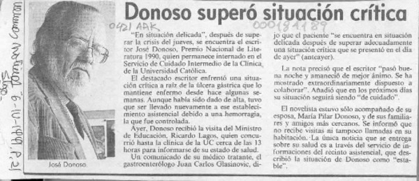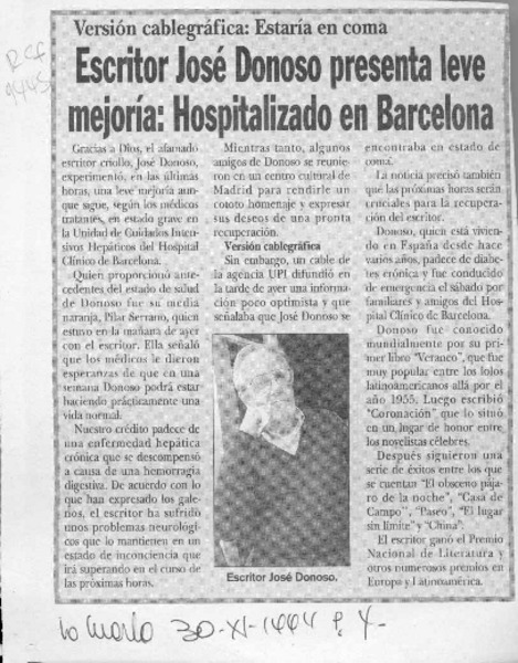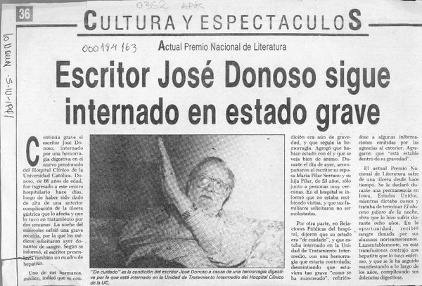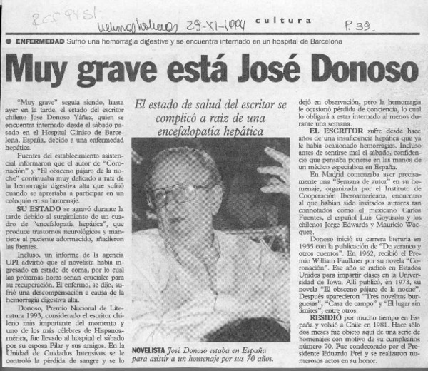 Se agrava estado de salud de escritor José Donoso [artículo].