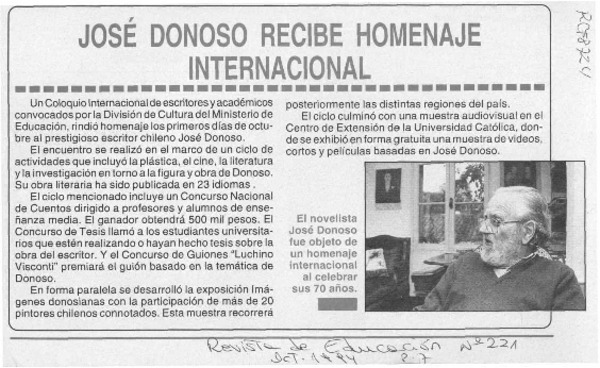 Una obra de José Donoso obtuvo el tercer lugar en el Festival Latinoamericano de Teleducación. [artículo]