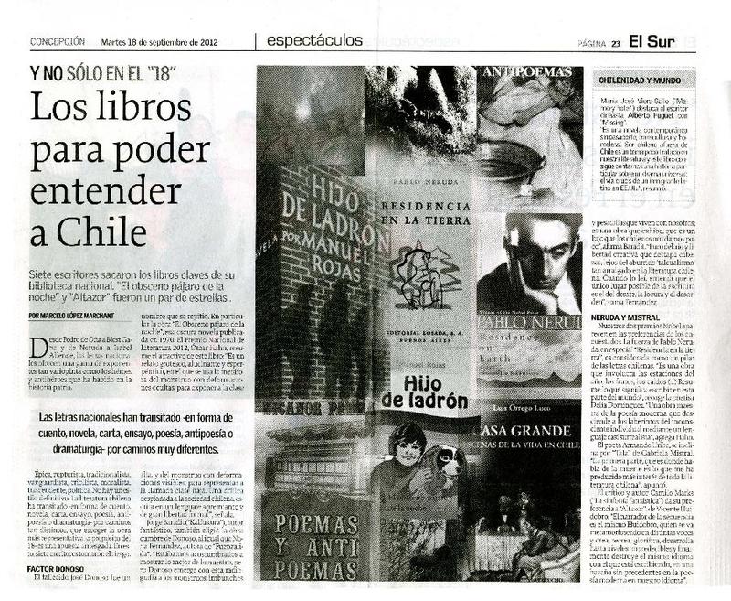 Autores chilenos - Neruda, Pablo - Serrano, Marcela - Allende, Isabel - Parra, Nicanor - Bolaño, Roberto - Rojas, Manuel - Sepúlveda, Luis - Donoso, José - Valdivieso, Mercedes - Gertner, María Elena - Serrano, Elisa