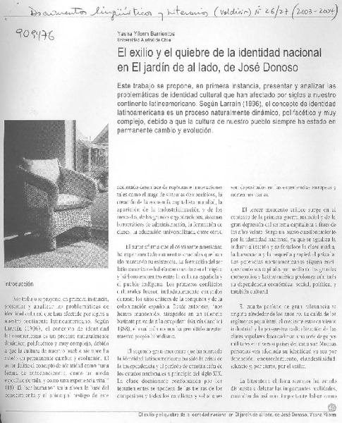 El exilio y el quiebre de la identidad nacional en El jardín de al lado, de José Donoso [artículo] yasna Yilorm Barrientos.