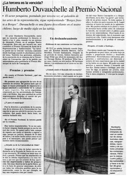 Humberto Duvauchelle al Premio Nacional : [entrevistas] [artículo]