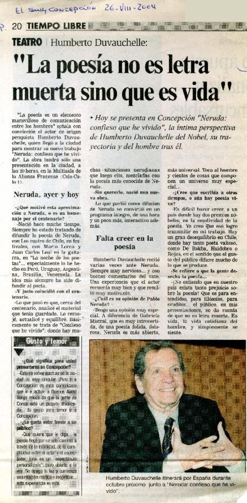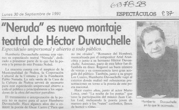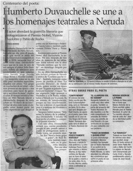 Humberto Duvauchelle se une a los homenajes teatrales a Neruda [artículo] Verónica Marinao.